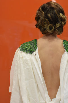 This ensemble is titled after the line of the fight song, "On to vict'ry / strike up the band!" With real toilet paper, it is ready to roll our beloved Toomer's Corner after a vict'ry on the field. It also features beaded shoulder epaulettes to scale of Toomer's Oak leaves.
